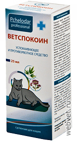 Ветспокоин суспензия — эффективное успокаивающее и противорвотное средство для животных на основе фенибута, прометазина, экстрактов пустырника, валерианы и натурального пчелиного маточного молочка. Активные действующие вещества усиливают друг друга и оказывают мягкое седативное, противорвотное, спазмолитическое, стрессопротекторное и адаптогенное действие. Препарат помогает нормализовать поведение животного (снизить агрессивность, повышенную боязливость), снять симптомы укачивания в транспорте (рвота, саливация, беспокойство и т.д.), снизить проявления стресса и наладить межвидовые отношения. Натуральное маточное молочко содержит в своем составе витамины группы В, минеральные вещества, аминокислоты, ферменты и оказывает восстанавливающее и нормализующее действие на нервную, гормональную и эндокринную систему животного.